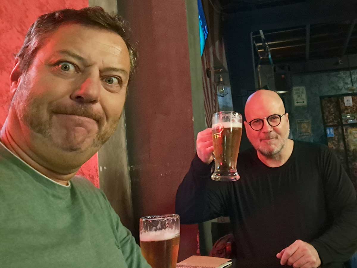 Paseamos por la ciudad, buscamos un sitio para cenar, vemos varias opciones aunque estamos en el centro y parecen todas bastante turísticas, terminamos en una cervecería que tiene algo de comida tradicional como los micis con cartofi (salchichas de cerdo con patatas) y un fish and chips para mi, la comida es muy abundante tomamos al menos un par de cervezas por barba.