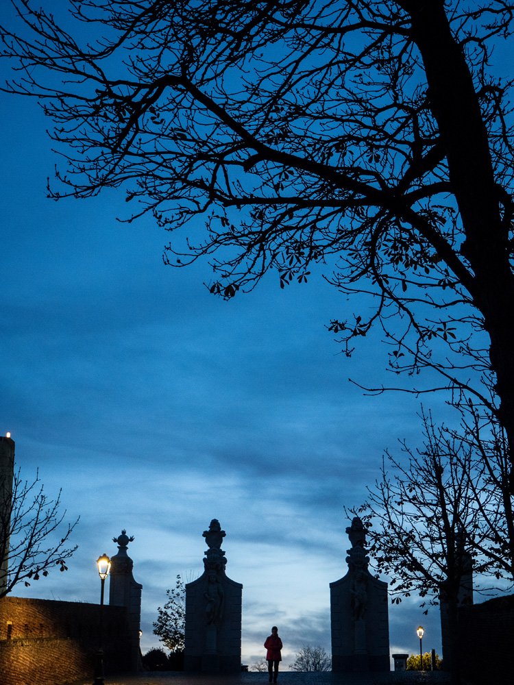 Cuando terminamos de dar un paseo, por el interior y ver los principales edificios, todos ellos adornados de bonitas esculturas en bronce, pasamos a dar un pequeño paseo por el foso, ya de noche. Nos acercamos a un pequeño mercadillo navideño sin ningún interés y pensamos que ya hace el suficiente frío y que por primera vez en nuestro viaje hemos cumplico todos los objetivos del día como para habernos ganado un cerveza. Nos cuesta encontrar un bar que nos brinde una buena cerveza. Mientras la tomamos buscamos un lugar para cenar. Encontramos un hotel que se llama «Miura» (¿tendrá algo que ver con España?), lo cierto es que tiene calamares a la romana y unos micis para Marcos. Según entramos el salón está presidido por la pintura de un toro bravo, así que deducimos, que si, que algo tendrá que ver con España. Nos aventuramos a pensar que algún lugareño emigro a España y volvió con dinero suficiente para abrir un negocio allí. Hablamos de los «indianos» españoles y como invertían las ganancias conseguidas en ultramar en sus poblaciones de origen.